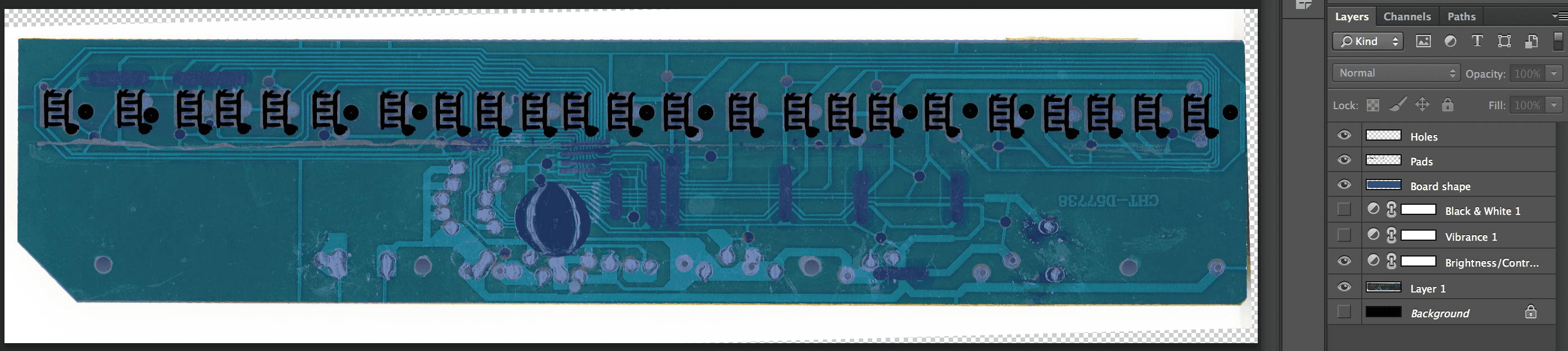 Tracing the important parts in Photoshop. The black parts will end up as a single copper layer or hole positions…:
